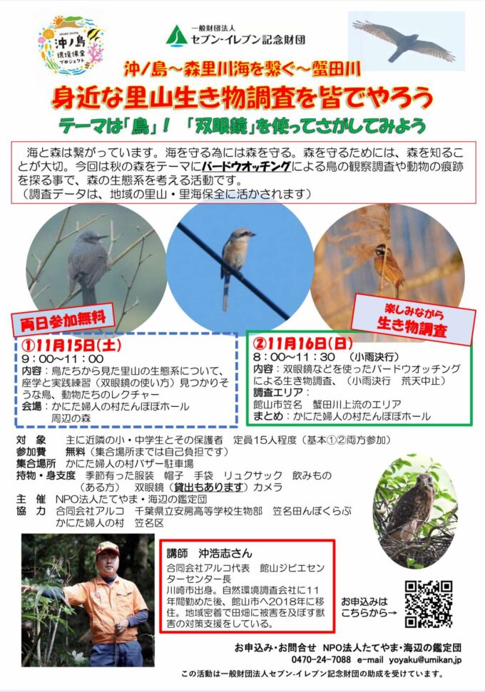 海と森は繋がっています。海を守る為には森を守る。森を守るためには、森を知ることが大切。今回は秋の森をテーマにバードウオッチングによる鳥の観察調査や動物の痕跡を探る事で、森の生態系を考える活動です。